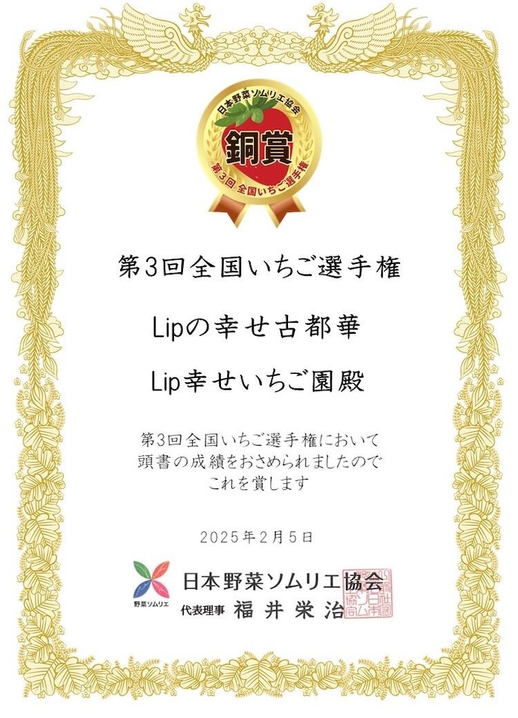 ・全国いちご選手権(野菜ソムリエ協会主催):銅賞受賞(385点中)